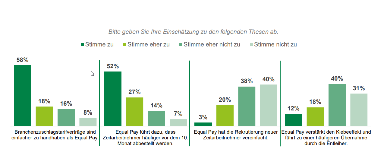 Ziemlich einhellig sind Personaldienstleister:innen der Meinung, dass ein Branchenzuschlagstarifvertrag im Gegensatz zu Equal Pay einfacher zu handhaben sei. Eine Mehrheit hat ebenfalls beobachtet, dass Equal Pay tatsächlich zu mehr Abbestellungen vor dem 10. Monat führt. Davon ist besonders die Gruppe der Helfer:innen betroffen – sicherlich nicht der gewünschte Effekt der Gesetzänderung. Demnach gibt es durch das Gleichstellungsgebot bei der Arbeitnehmerüberlassung auch Nachteile für alle Beteiligten.